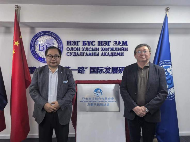 9月2日上午,在蒙古国“一带一路”国际发展研究院举行了亚太交流与合作基金会乌兰巴托联络处揭牌仪式,蒙古国外交部顾问、前驻中国大使钢呼雅格,蒙古国“一带一路”国际发展研究院执行院长刘亚丛教授,代表团成员及相关人士共同见证了这一时刻。之后又举行了座谈会,围绕蒙古国投资环境的新形势及东北亚经济的新格局,展开了广泛的交流;尤其探讨在“一带一路”倡议下,如何结合蒙古国实际情况,开创“草原之路”新局面的议题。