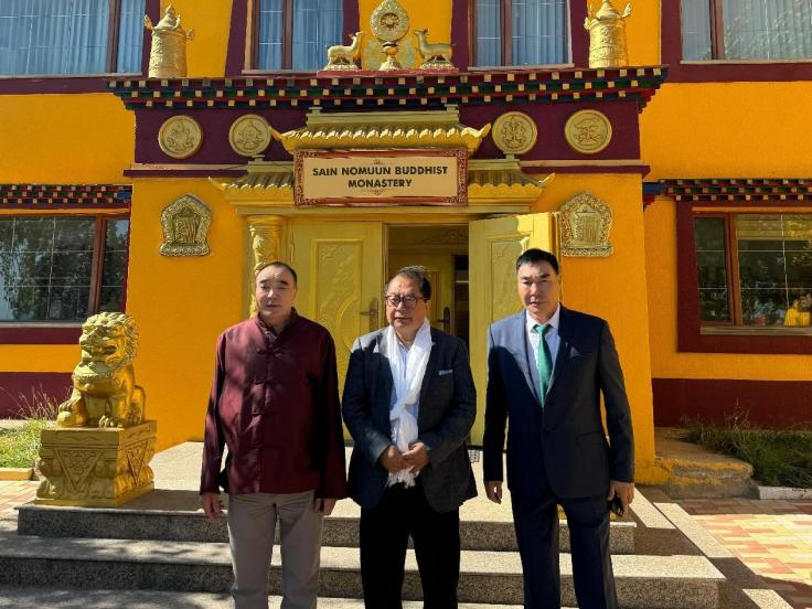 蒙古国赛音诺门寺住持纳尔贵·赛布彦(左)与肖武男执行副主席(中)合影