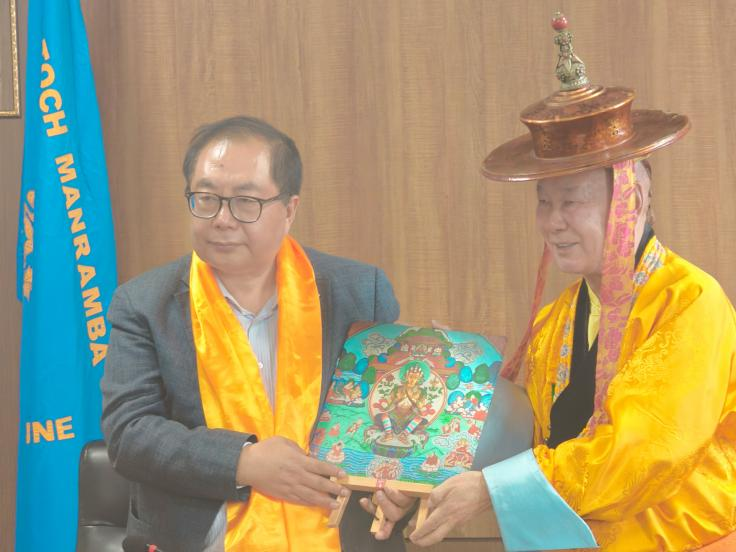 下午应蒙古国奥托奇曼兰巴大学校长、曼巴大场寺堪布D·纳察格道尔吉邀请,代表团前往该学校,就双边佛教交流、蒙医合作等话题进行了座谈,取得了广泛共识。大学还特意组织寺庙高僧,以佛教和蒙古传统文化礼节,为代表团全体成员举行祈福仪式,并向代表团团长肖武男赠送珍贵的佛教礼物。