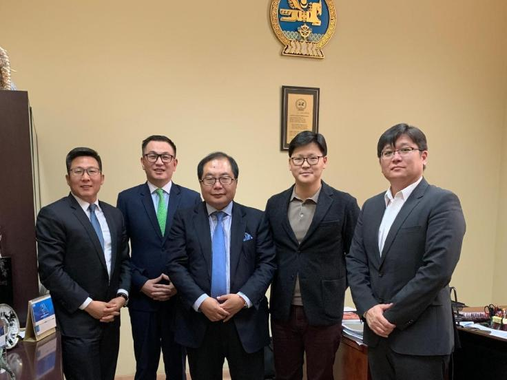 蒙古证券交易所时任首席执行官杭盖•阿拉泰(左二)、蒙古国外交部官员功布·布木策恩德(右二)与肖武男执行副主席(中)会面