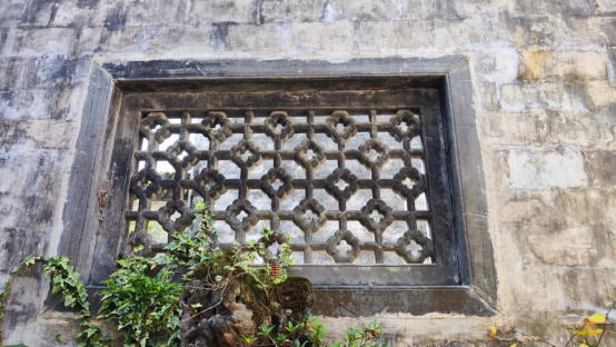 徘徊在西园中院,目光被墙上精美的石雕漏窗吸引,左为松石图,右为竹梅图,堪称“徽州三雕”中之精品。