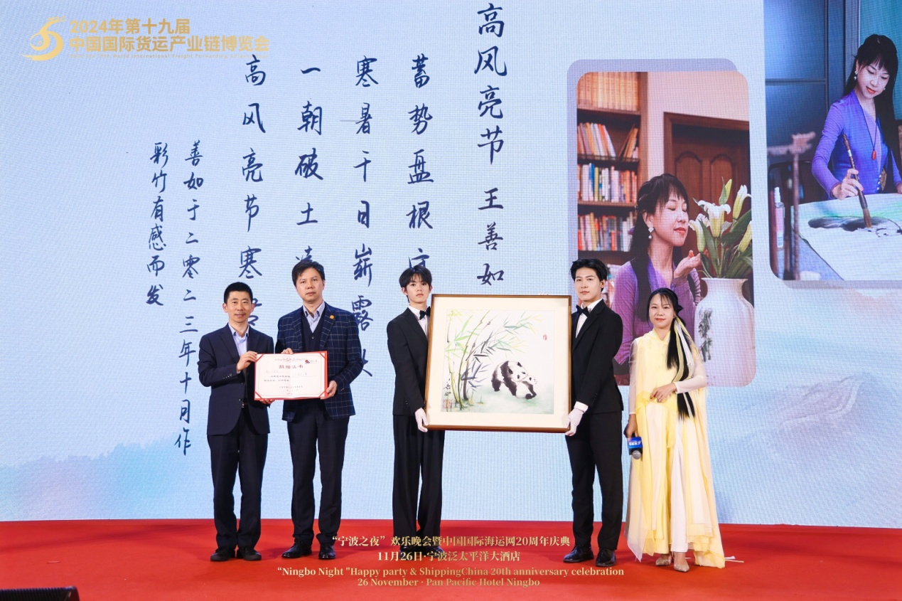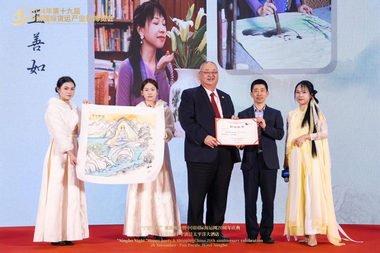 在当晚举办的第十九届中国国际货运产业链博览会之“宁波之夜”欢乐晚会上举行的慈善拍卖活动中,广州乾雍进出口贸易有限公司总经理王善如捐赠两幅自己绘制的画作用于大会慈善拍卖。