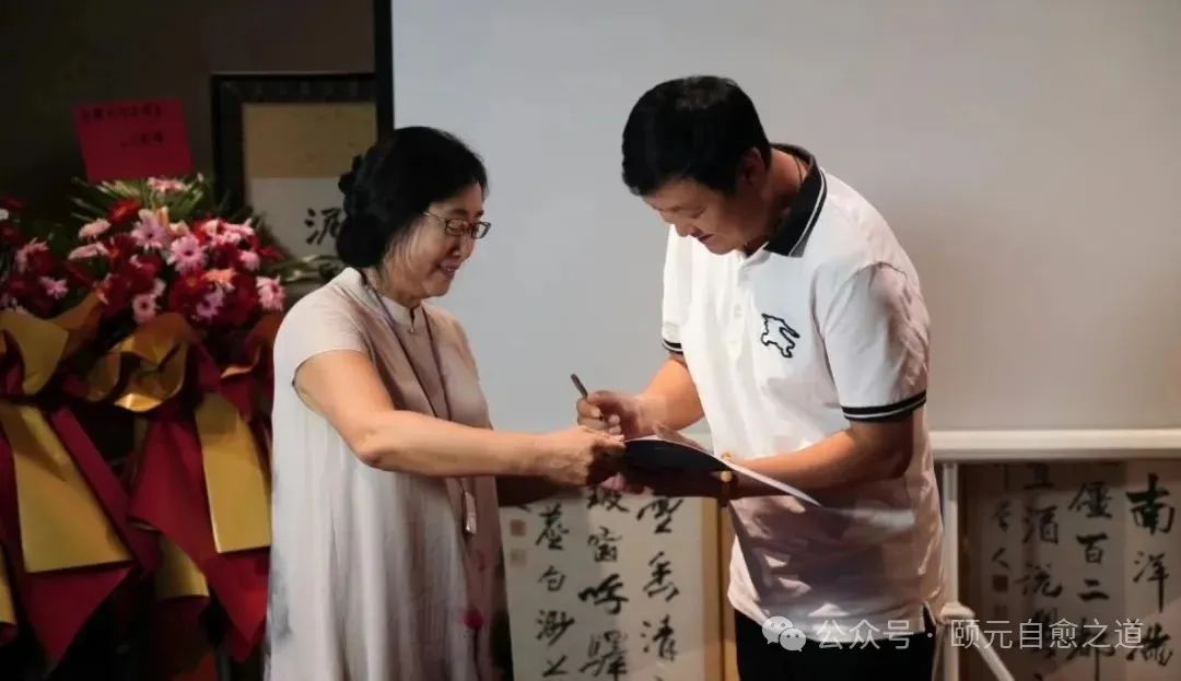 万方会员、颐元医学人体内药自我疗愈学员、上海众缘文化传媒董事长赵健敏、大连新闻传媒集团外宣节目编审王辉代表全家赠送万方锦旗。