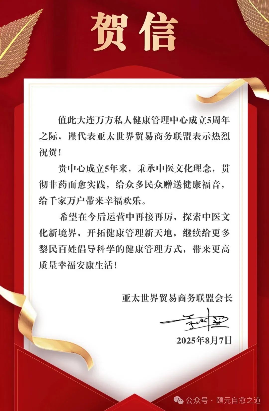 2025年8月17日,四年后的同一天,再次成为万方会员,刘传福董事长携夫人从山东专程来大连奔赴健康,采用颐元疗法阶段性系统调理、认真上万芳老师一人一方私教课,一心想把那些适合自己的实用方法都学到手,落实到生活中。“今后健康在您的指导带领下坚如磐石。”