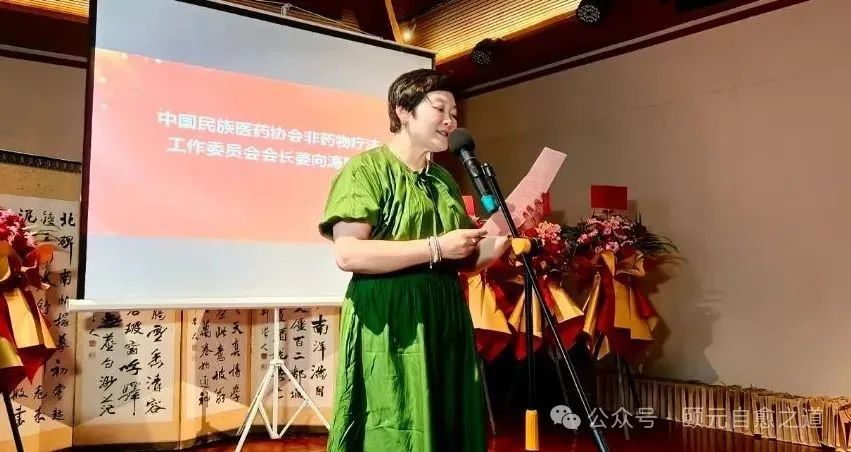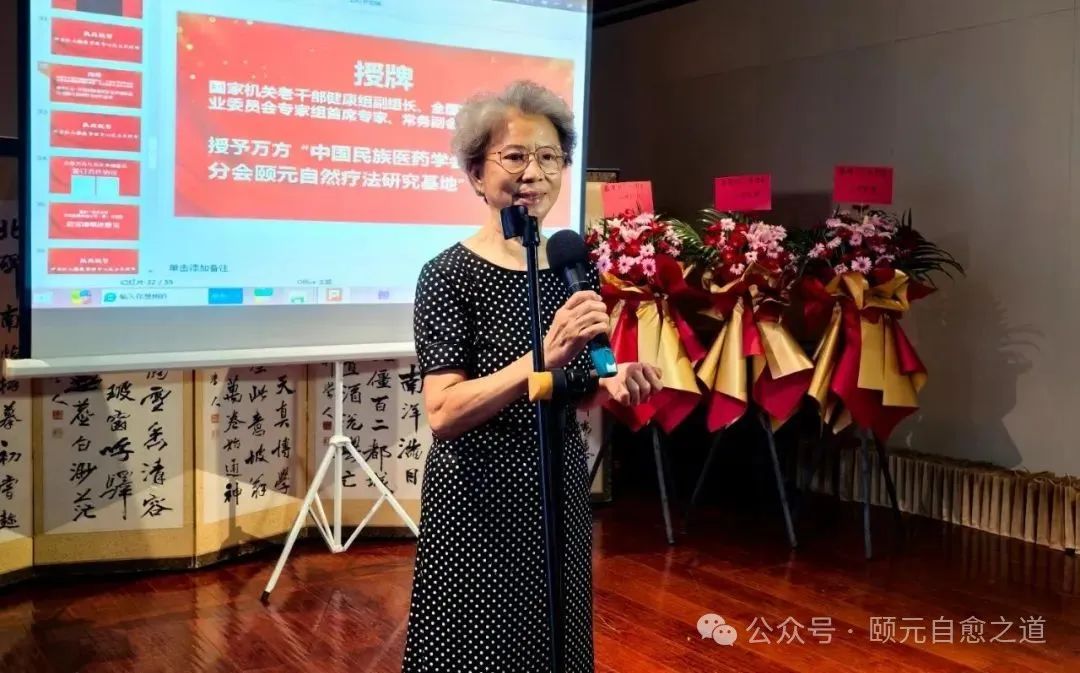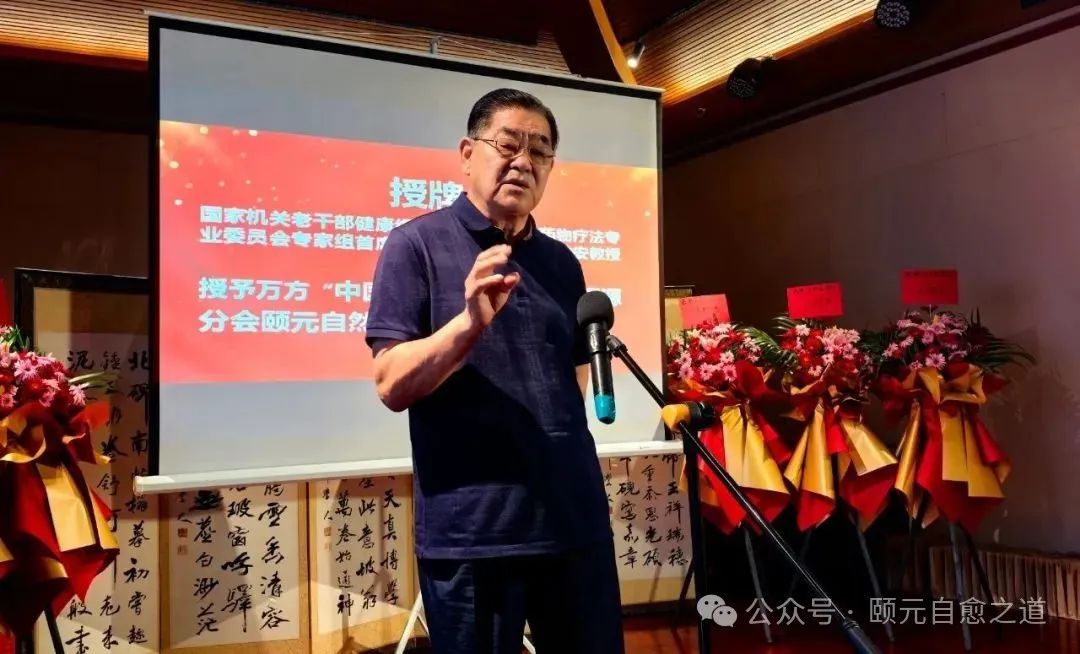 由国家机关老干部健康组副组长、全国非药物疗法专业委员会专家组首席专家、常务副会长盖龙安教授为万方颁发“中国民族医药学会药食同源分会颐元自然疗法研究基地”牌匾并致辞。