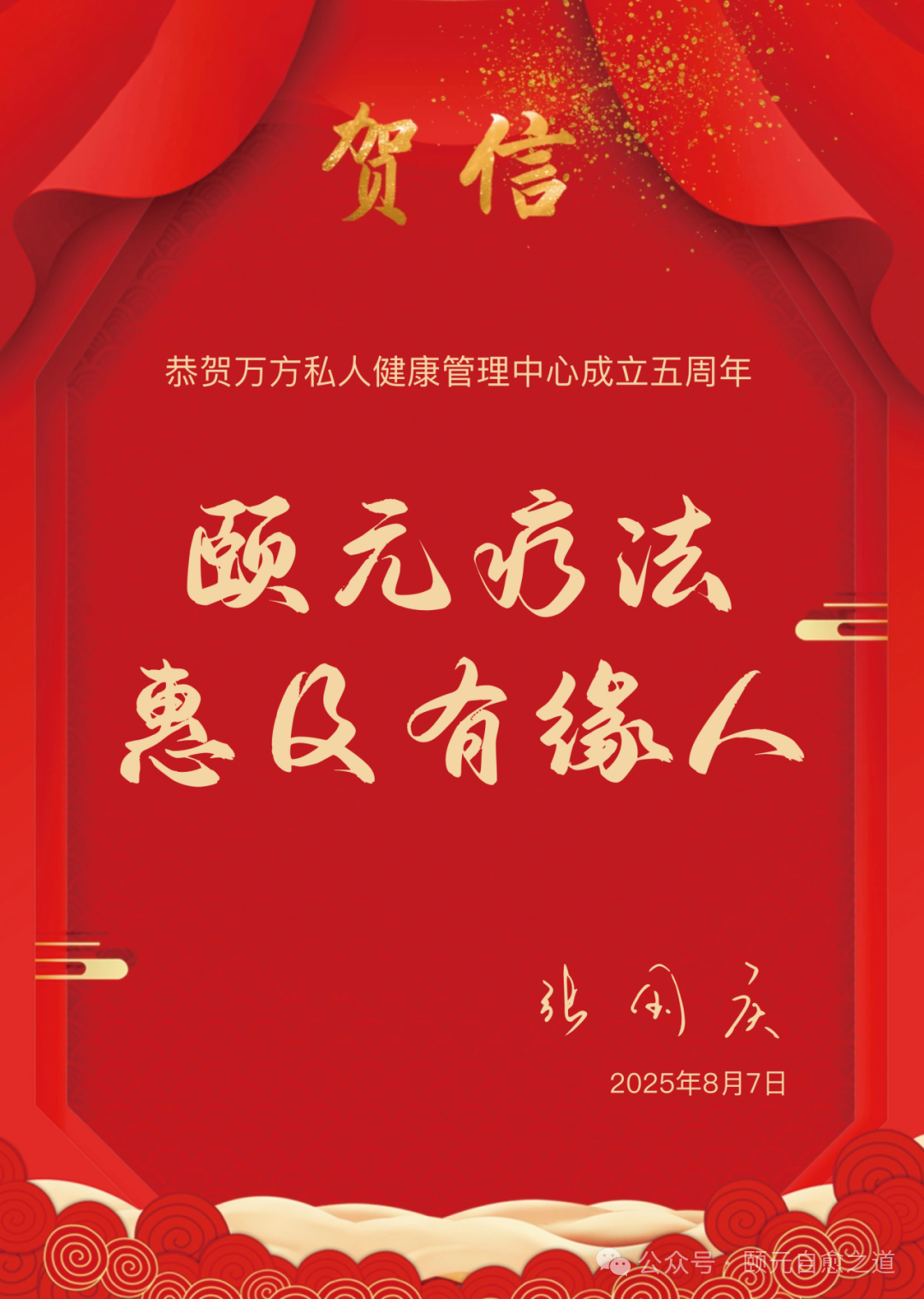 “万方成立5周年庆活动,虽不能至,心怀感恩,遥寄祝福,衷心祝万方健康在您引领下,杏林春暖,惠泽四方,5周年庆活动圆满成功。”