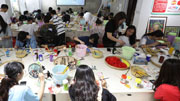 4月24日,在广西三江侗族自治县三江侗画馆,学生在体验侗画文创产品创作。
