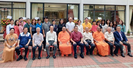 陈宛青、刘乐博士向各位嘉宾赠送道坚大和尚的作品(拿督斯里蔡志权 左三、拿督斯里张天赐左五、拿督达摩拉达那长老 右三)
