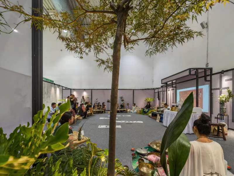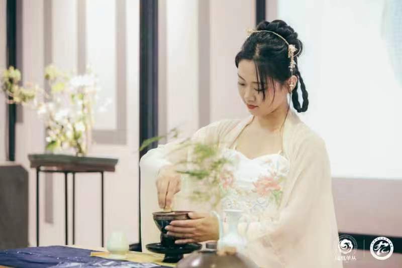 大连永生文化发展有限公司携大连金州新区天灵职业培训学校,应华巨臣茶博会邀请,从宋代点茶、明清以后的冲泡法、新中式茶饮,通过颂钵、舞蹈、古琴、香道、插画等形式表现,尤其是从海外归来、首批考取茶饮调制师的二代茶人杜佳鑫执壶操作,演义了“云雾缭绕”品鲜萃茶、“云漫金山”和“半山半水”品调饮茶。