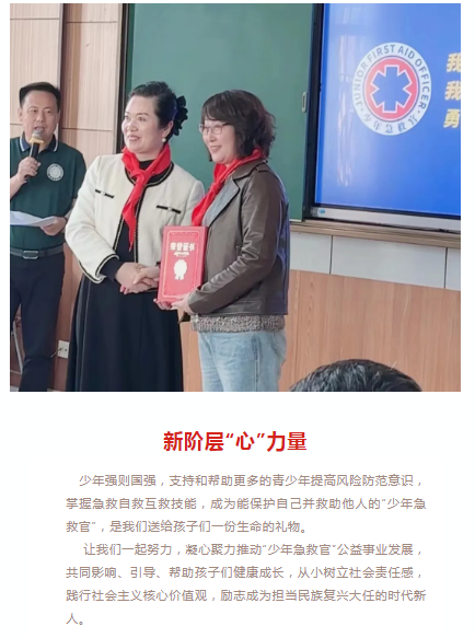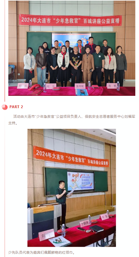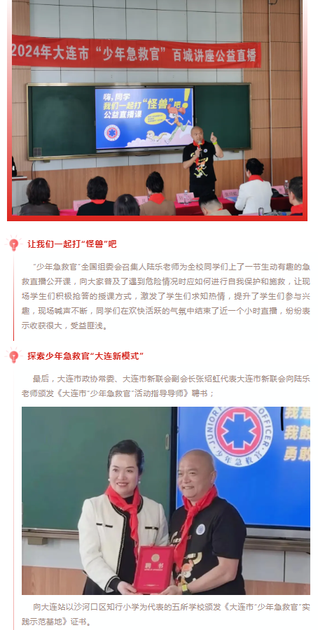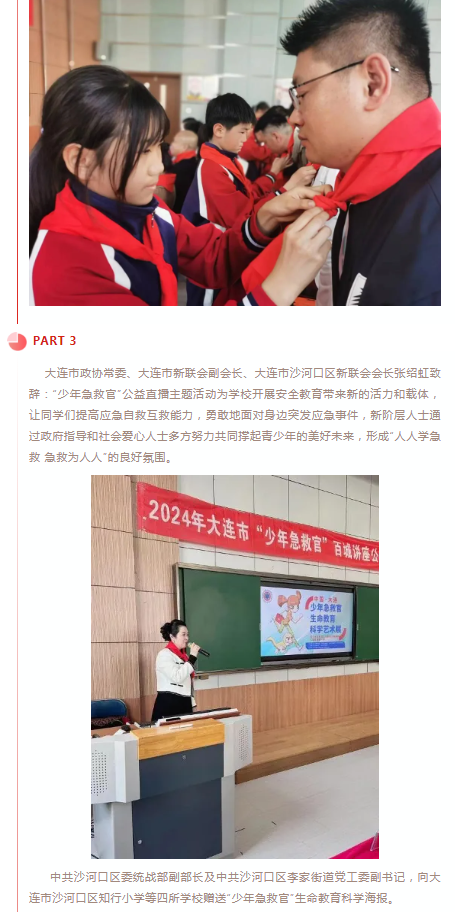 此次活动在中共大连市委统战部指导和支持下,由大连市新联会主办,中共大连市沙河口区委统战部协办,由大连市沙河口区新联会、大连金普新区保航安全志愿者服务中心承办的“少年急救官”公益直播活动在大连知行小学多功能厅隆重举行,并由大连电视台在“少年急救官”组委会视频号进行全国直播。