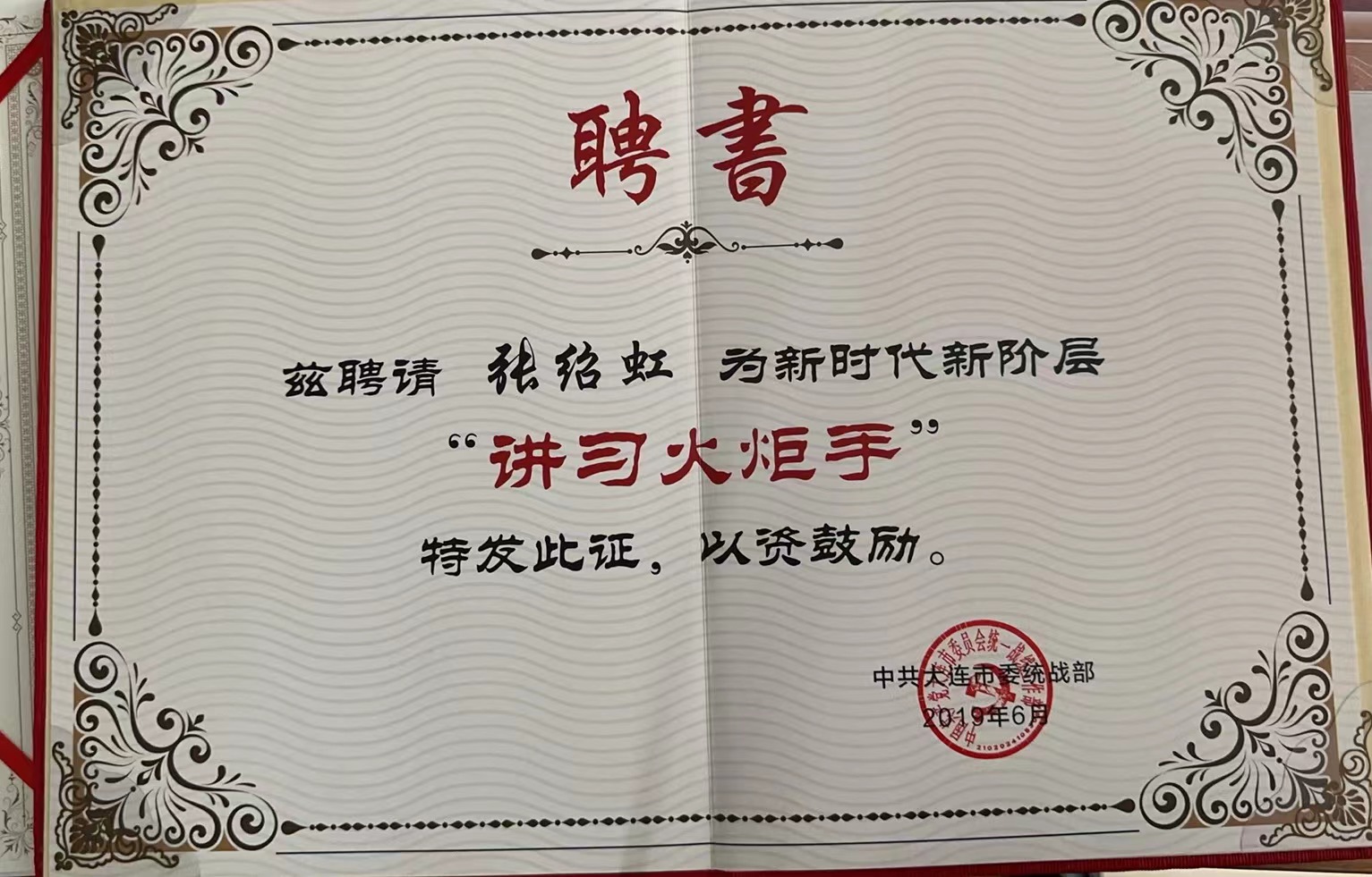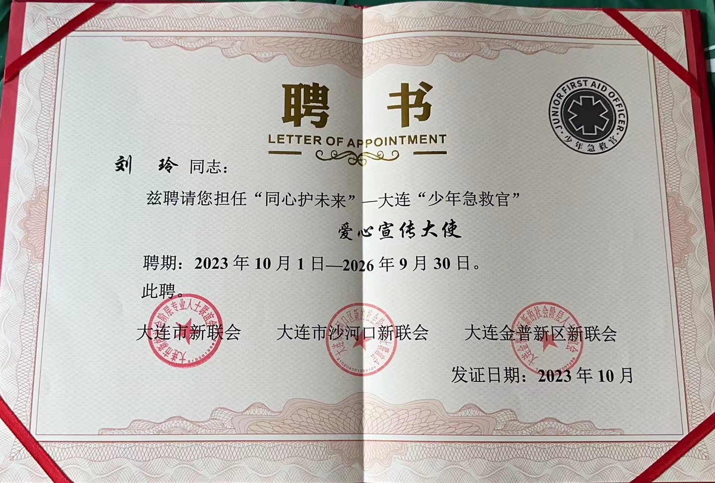 大连市政协常委、大连市新联会副会长、大连市沙河口区新联会会长张绍虹,充分发挥自己的组织领导力和创新精神,积极投身到少年急救官活动的策划和组织中,服务团积极与教育部门合作,开展“少年急救官”大连站培训活动,向名师生培训自救互救技能,受到了老师家长和同学们的好评。她还积极与其他新阶层人士合作,共同推动活动的广泛开展,为少年急救官活动做出了重大贡献,荣获中央统战部授予的“2023年度新的社会阶层人士服务团优秀团员”称号。