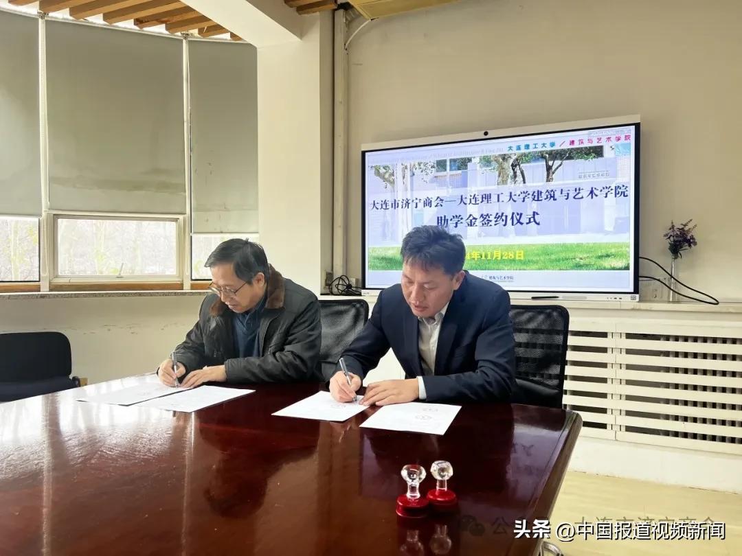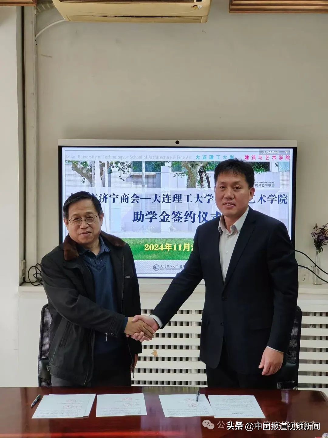 大连理工大学建筑与艺术学院院长蔡军与大连市济宁商会党支部书记、会长、金柏建设工程有限公司董事长黄书伟签订助学金协议。