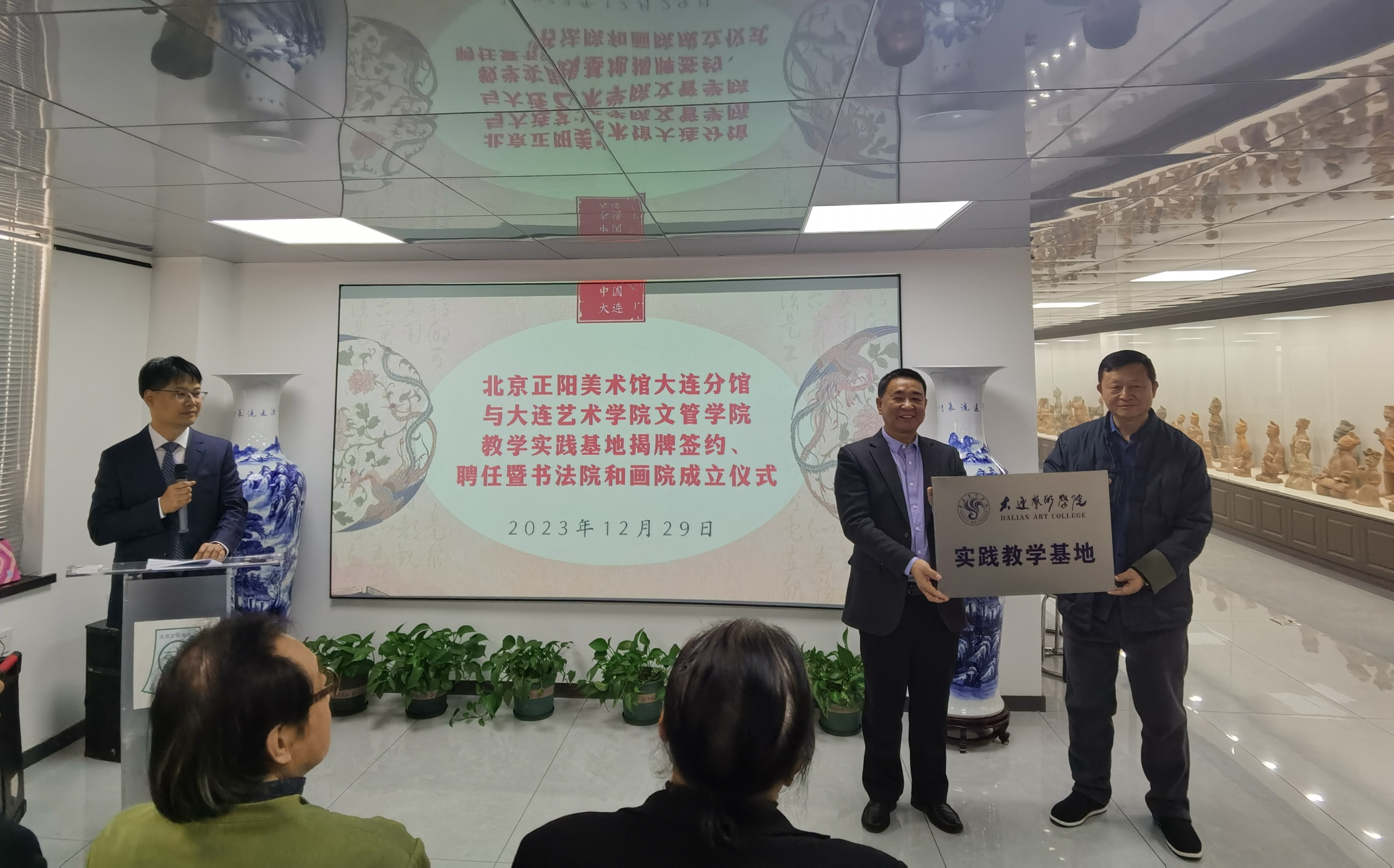 右:北京正阳美术馆大连分馆王俊生馆长、左:罗昌智院长共同为教学实践基地揭牌。