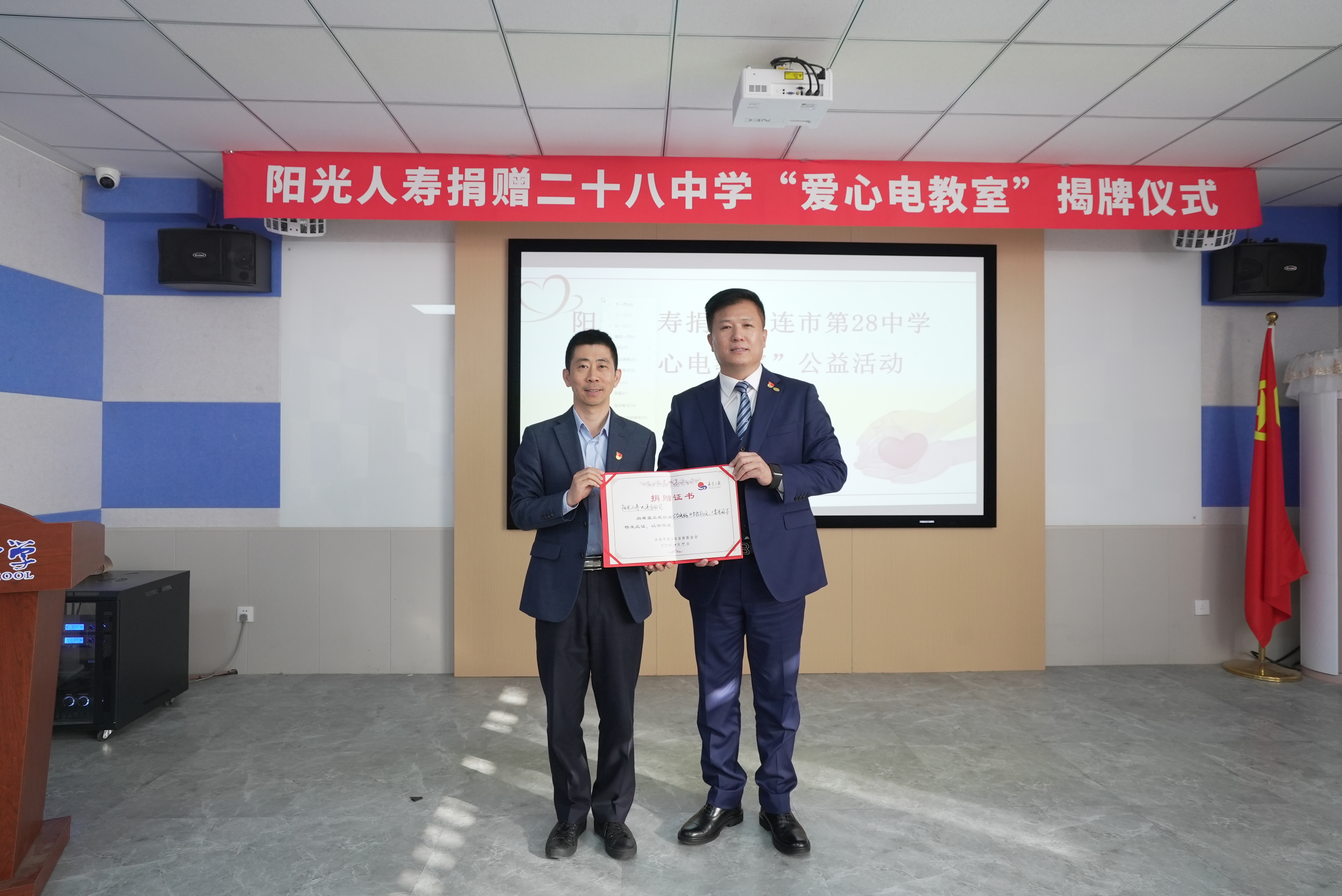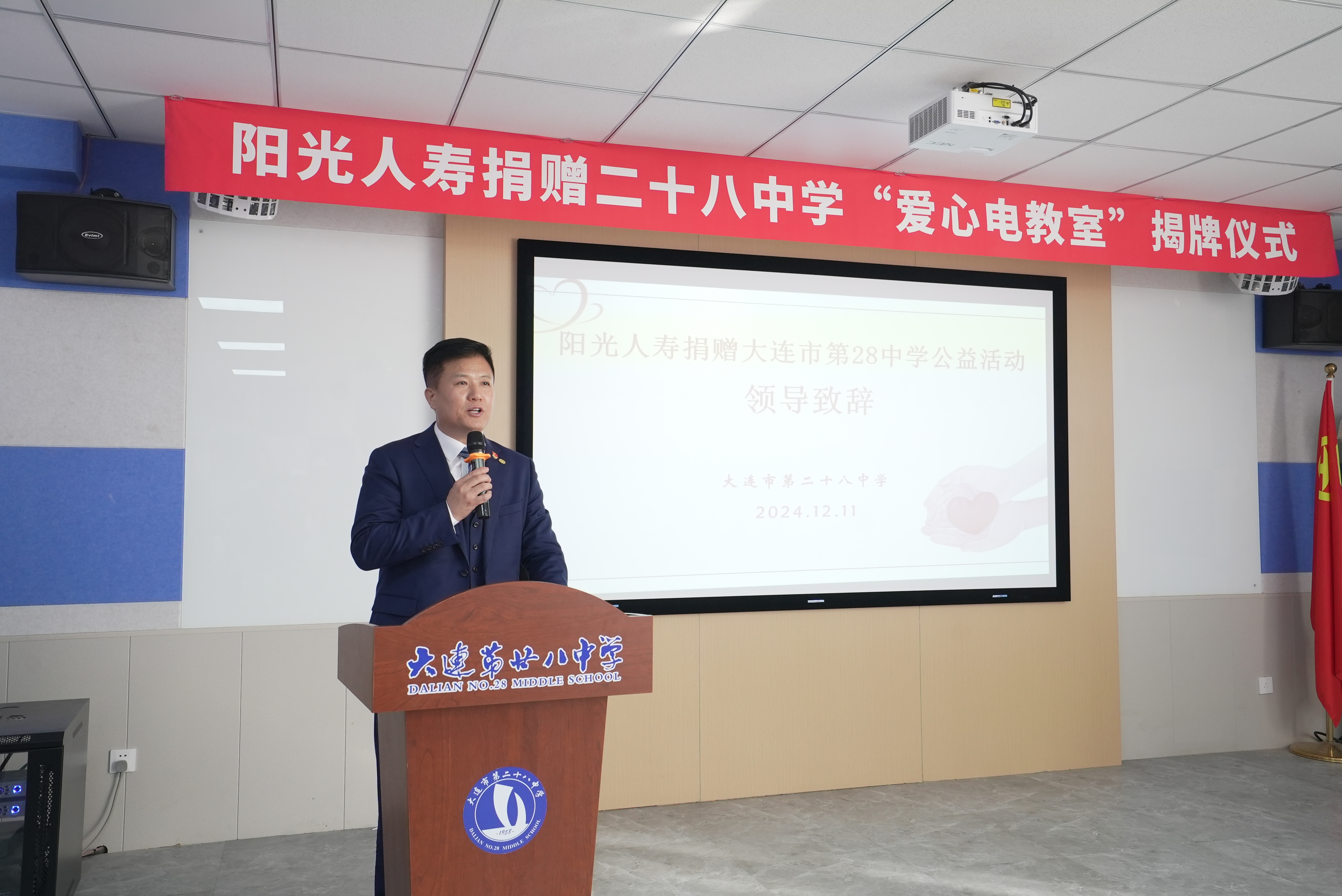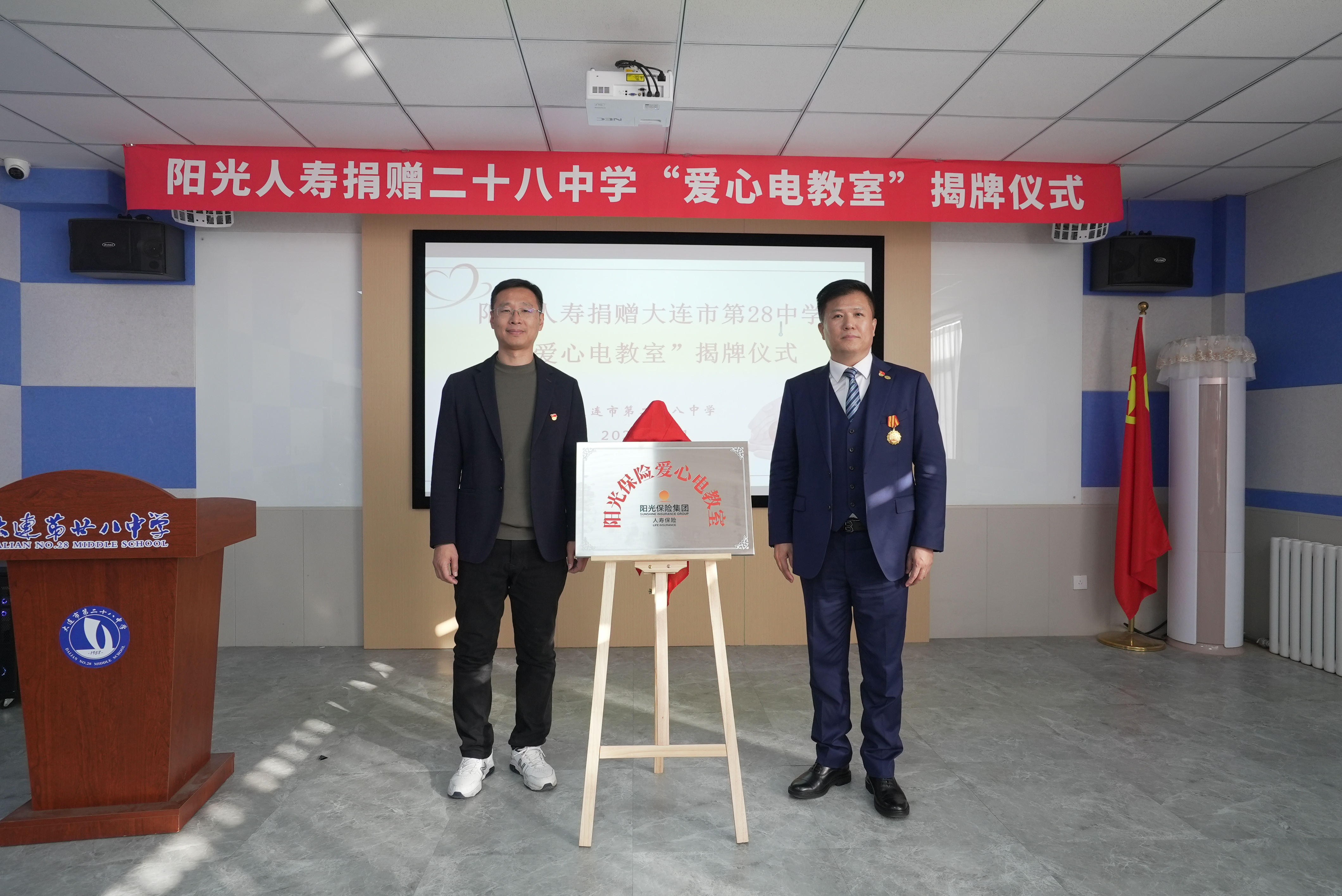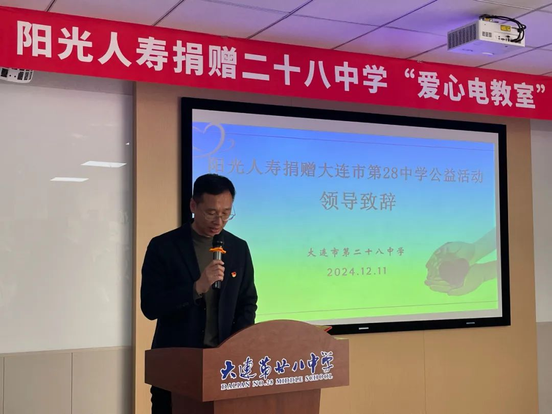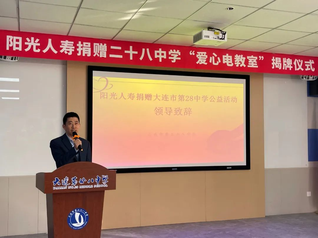 欧亚通讯社电(记者耿玲)12月11日下午,大连市青少年发展服务中心、市青少年发展基金会联合阳光人寿大连分公司,在大连市第二十八中学举行“阳光人寿捐赠二十八中学‘爱心电教室’揭牌仪式”。阳光人寿大连分公司共捐款25台电脑、4台投影仪、1套音箱、30张折叠桌、32把折叠椅,用于该校电脑室的改善。此次活动还为学生们带去排球20个、足球20个、篮球10个以及木刻板100套。市青少年发展服务中心副主任、市青基会理事长宋继君,阳光人寿大连分公司党总支书记、总经理许树玉,总经理助理李晨以及公司员工代表,大连市第二十八中学校长姜策及校内老师和学生代表参加仪式。
