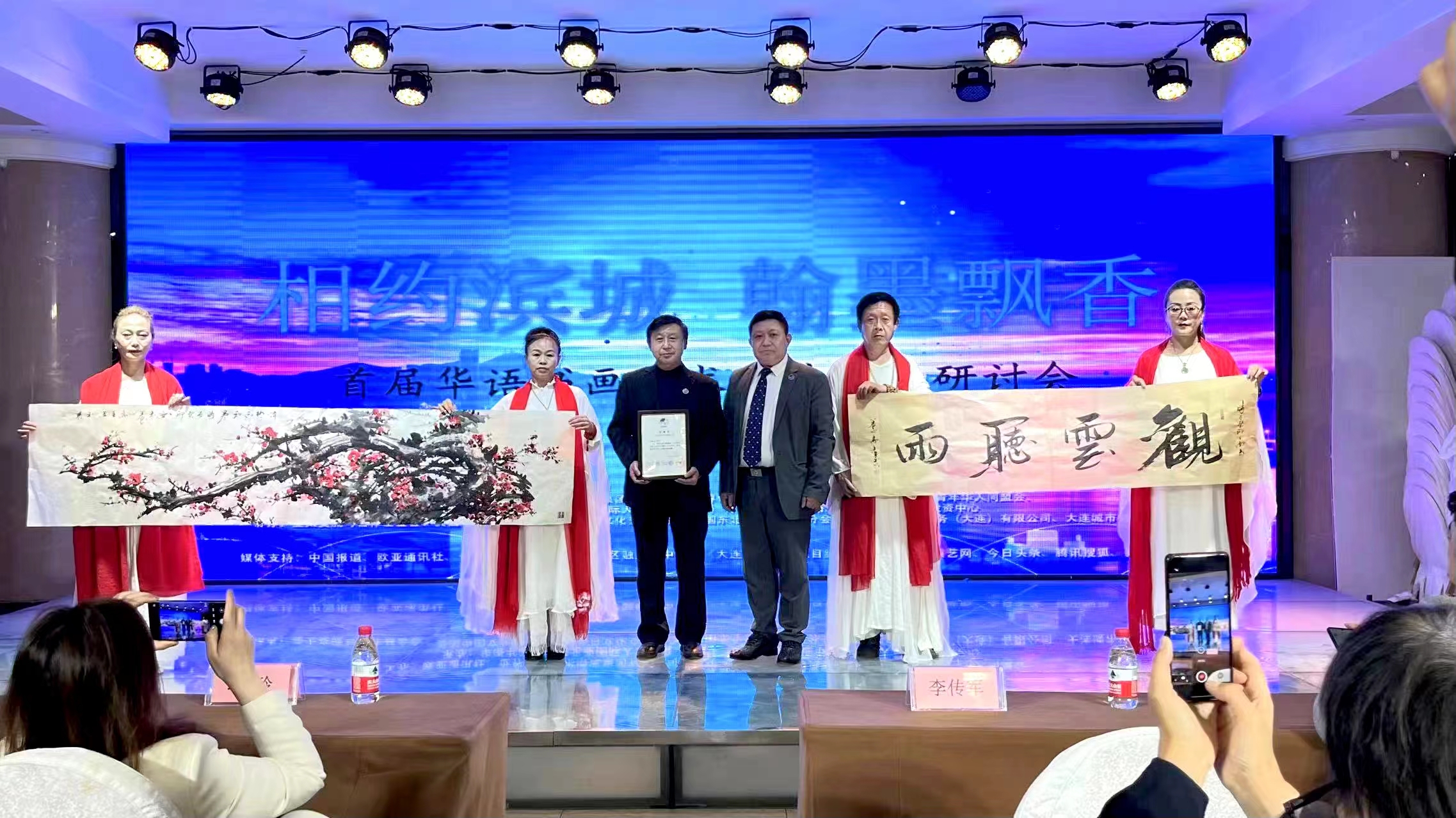 活动现场,书画艺术家们挥毫泼墨,一幅幅栩栩如生的作品映入眼帘。表演艺术家们用歌曲和舞蹈点燃全场氛围。大连城市时尚馆还带来了精彩的时装秀表演,赢得现场观众阵阵掌声。书画交流与演出结束之后,主办方为艺术家们颁发了收藏证书与荣誉证书。