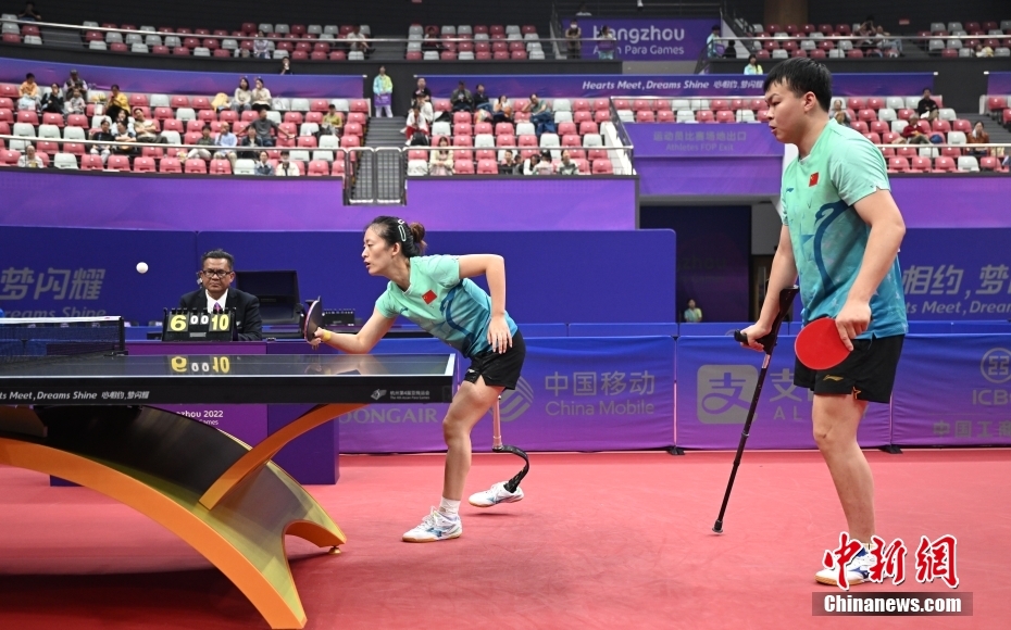 欧亚通讯社电,10月27日,杭州第4届亚残运会乒乓球混合双打ClassXD14四分之一决赛在拱墅运河体育公园体育馆举行,曾在汶川地震中失去右腿的中国选手王睿(右)和队友闫硕(左)3比0战胜中国香港队晋级半决赛。