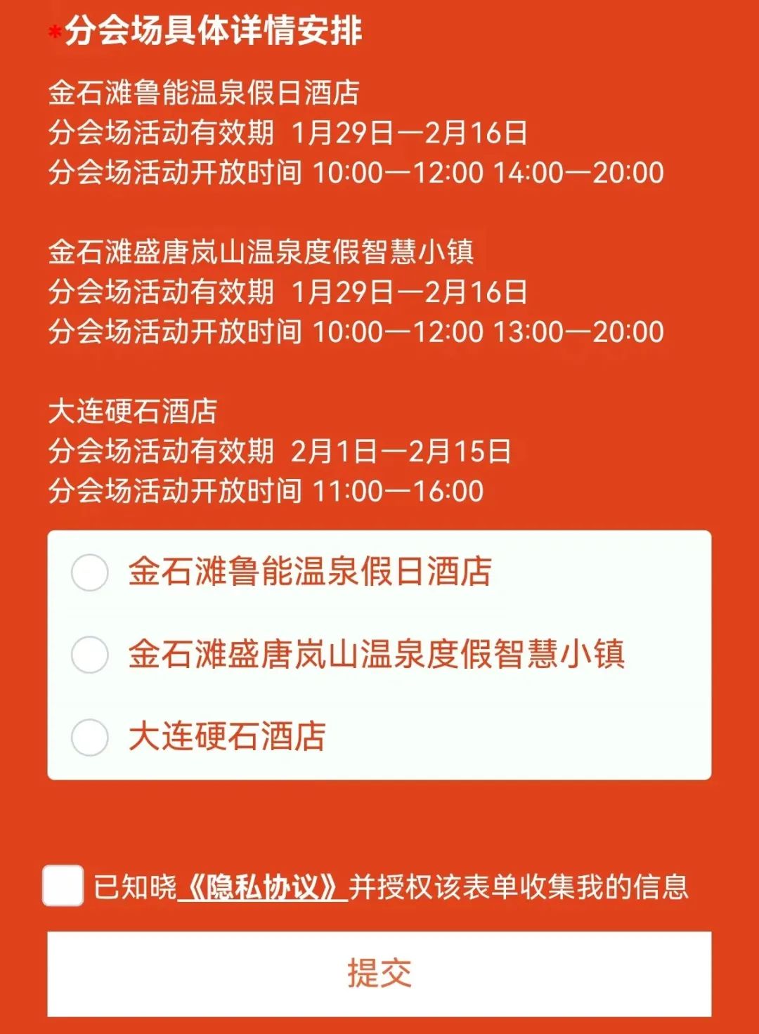 活动设大连金石滩鲁能希尔顿度假酒店、大连金石滩鲁能温泉假日酒店、大连金石滩盛唐岚山海上日出酒店、大连硬石酒店等4个会场。其中,启动仪式专场在鲁能希尔顿度假酒店。期间,市民游客可任选会场在指定区域参加活动。