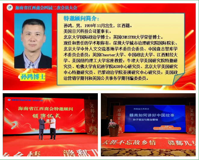 会议中,举行了海南省江西商会特邀顾问授牌仪式。海南省江西商会会长陈斌为北京大学国际政治学博士、英国CHESTER大学荣誉博士孙鸿先生授予“海南省江西商会特邀顾问”牌匾。