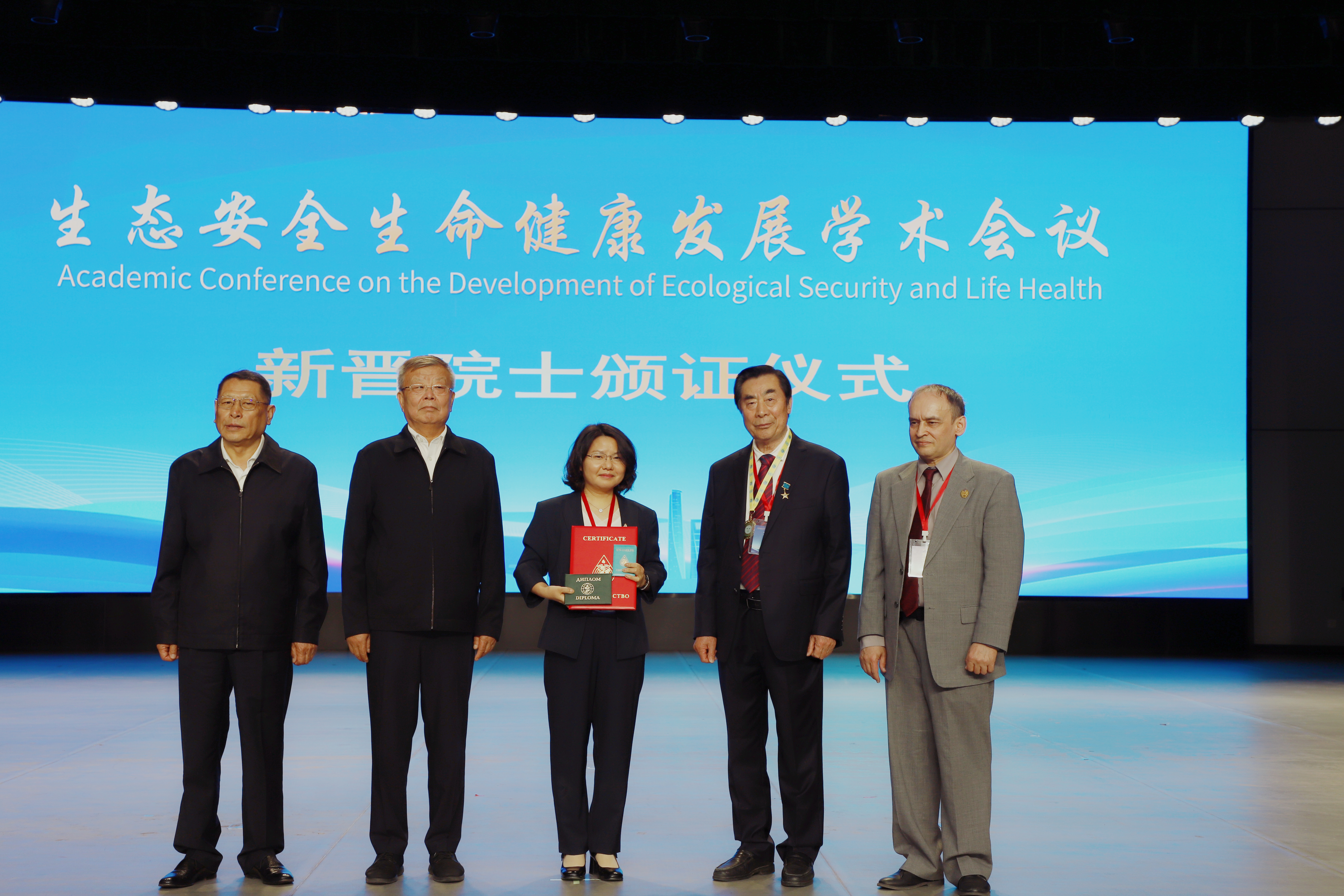 图为:由联合国-国际生态生命安全科学院副主席、院士、中国分院院长、中国医药教育协会终身荣誉会长黄正明先生(右二);全国政协常委、政协第十三届全国委员会原副秘书长、九三学社中央原副主席赖明先生(左二);联合国-国际生态生命安全科学院总院副主席、院士、俄罗斯联邦萨马拉国立医科大学教授德米特里先生(右一);中央组织部干部一局原局长刘晔华先生(左一)作为颁证嘉宾向梁芳博士颁发《联合国-国际生态生命安全科学院通讯院士证书》。