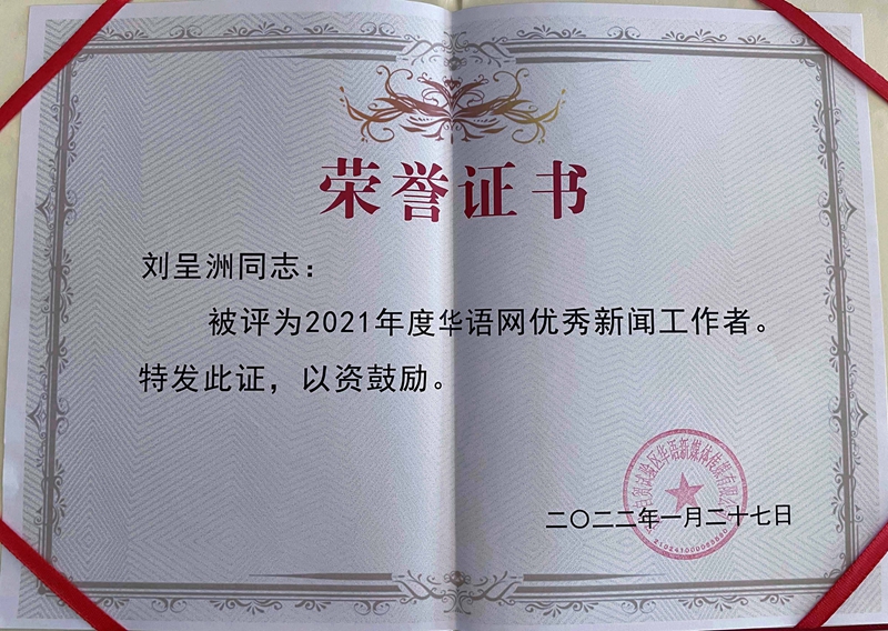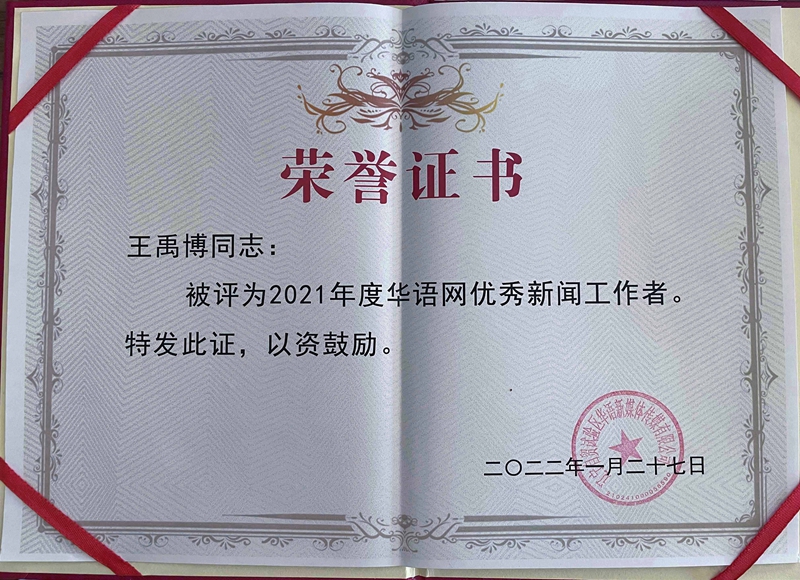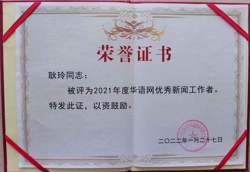 欧亚通讯社电(记者 耿玲)2021年,是平凡而伟大的一年,在全球新冠疫情下,中国疫情得到有效防控,经济稳定向好发展,作为新闻媒体,在做好本职工作的同时,更应为社会乃至国家的稳定发展贡献微薄之力,保驾护航。2022年1月28日上午,华语网召开的年终总结会,并为表现突出的耿玲、王禹博、刘呈洲三人,颁发了2021年度优秀新闻工作者荣誉证书,由李传军主任颁奖。