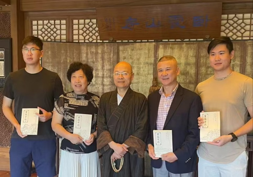 图为: 灵隐寺方丈光泉法师向徐永贤及其家人赠送《灵隐寺寺志》